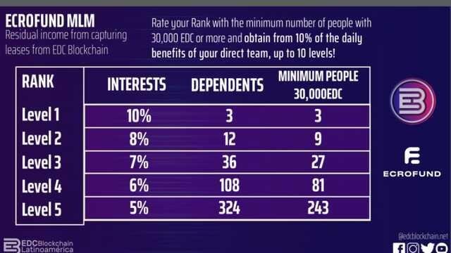This is a great innovatie on the EDC blockchain that work in the order of Multi-Level Marketing structure which enables community members to earn from leasing to Masternode and also earn for bringing in new members into the system. This system encourages users to invite more people to lease EDC coins to the masternode, because the more they invite other users, the more their earning increases. The Members that can lease at least 30,000 EDC Coins to ECROfund becomes qualified for the Multi-Level Marketing bonuses which makes Users to earn 10% of the earning of their first three direct referrals. Not only that, they will earn 8% on the second level referrals up to the fifth level with decreased percentage earning. You can Register here