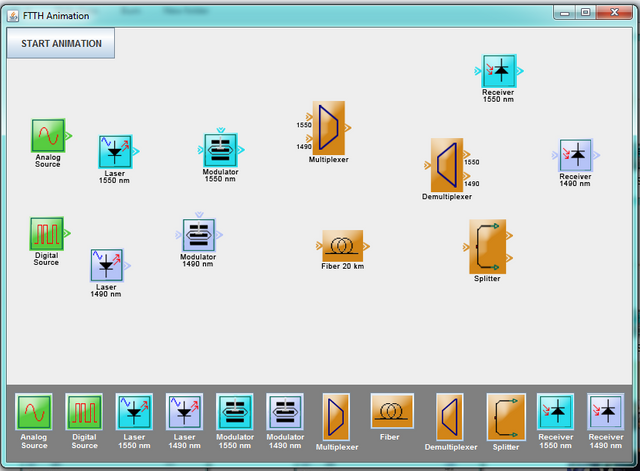 This is the flow process that occurred in the simulation of FTTH simulation, to run the simulation is by clicking the start button and the process will show how the signal and the laser flow into the modulator and multiplexed to the fiber optic with 20 km distance.