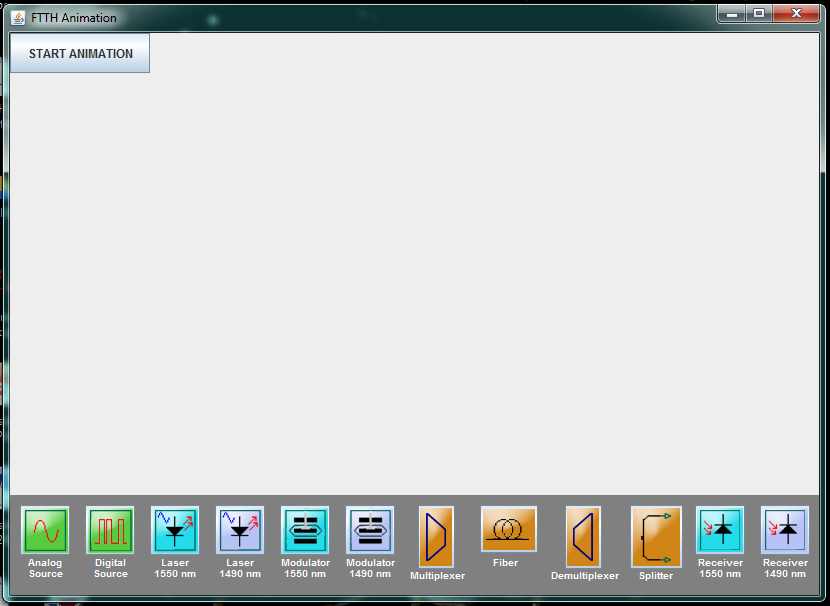 Simulasi serat optik ini dibuat dengan menggunakan Java Eclipse Software. Perangkat lunak ini dipilih karena keunggulannya, dapat beroperasi pada sistem operasi manapun. Gambar di bawah ini adalah halaman awal perangkat lunak simulasi, tampilan berwarna-warni ini untuk menghindari siswa merasa bosan selama belajar simulasi. Simulasi ini menyerupai desain seperti permainan kotak sederhana.
