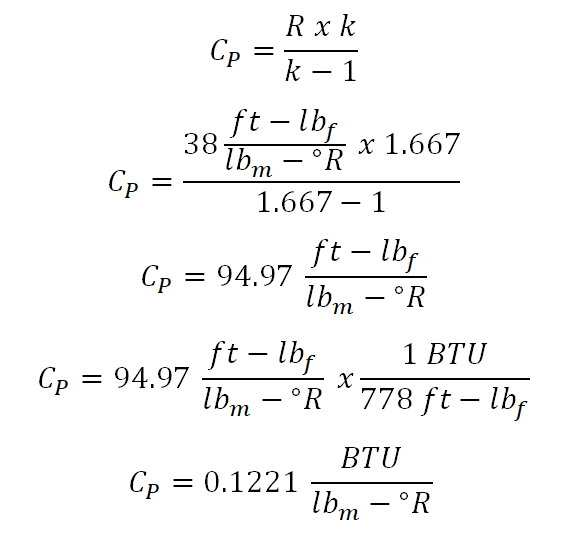 And the calculation being shown in the above photo, the value for the specific heat capacity at constant pressure (Cp) for the perfect gas is 0.1221 BTU per lbm per unit degree Rankine. Since we now have the (Cp), the solutions for obtaining the temperature at final state (T2), change in enthalpy (delta H) and the change in entropy (delta S) would be made possible and straightforward.
