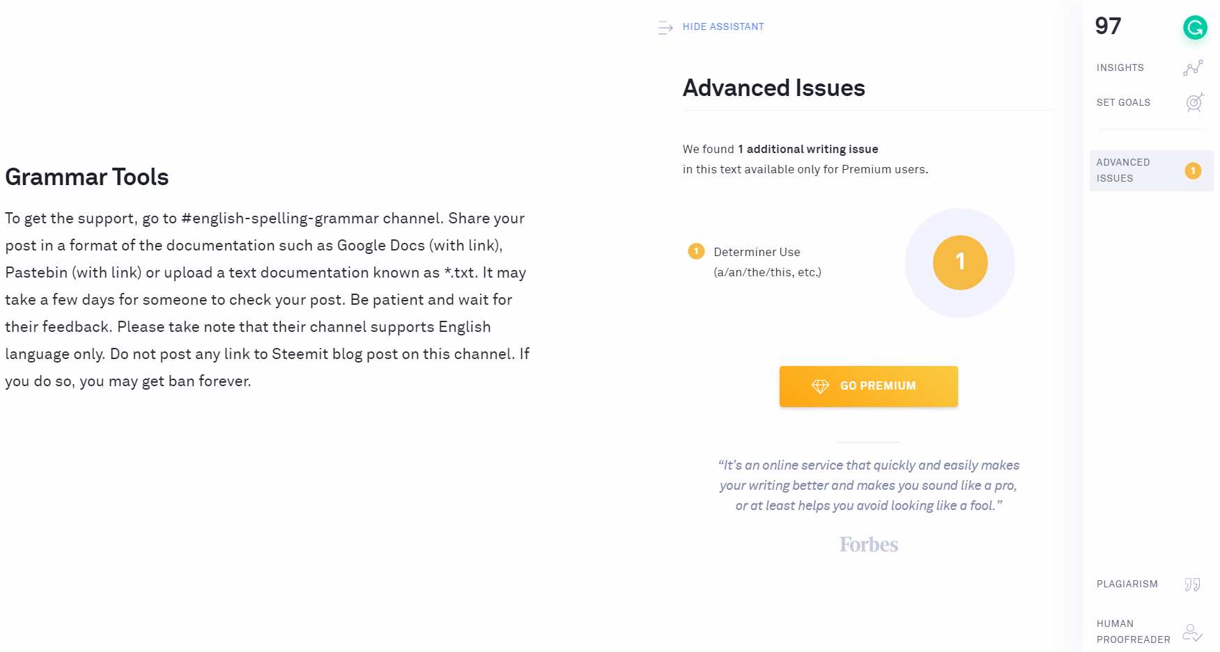 Grammarly 是一个在线应用程序,有助于识别英语拼写和语法在写作句子中的常见错误。此外,它还提供标点符号,词语选择和写作风格的建议。它可以提供对错误措辞的解释以及如何替换或改进它。它也给你的文章或文章的整体文本评分。 在发布您的博客文章或文章之前,建议您至少有85分。使用它是免费的。 但是,通过高级付款的订阅,它可以促进对措辞,检查复制和粘贴抄袭和人体校对。