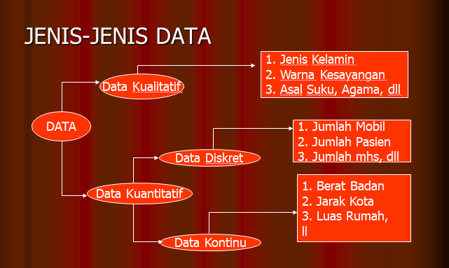 Lebih mudah untuk mengingatkan data diskrit bahwa tidak berkoma artinya bulat, misal jumlah pasien 15 tidak ada 15,4, sedangkan data kontinu berkoma seperti berat badan 60,7 kg.