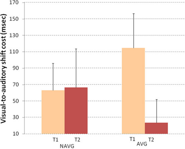 Similarly to Harrar et al.’ s analysis44, we calculated unisensory accurate reaction times (RTs) for each child both, when the previous stimulus was the same (e.g., two successive visual trials) and when it was different (e.g., a visual trial followed by an auditory trial). Visual (i.e. from auditory to visual) and auditory (i.e. from visual to auditory) shift costs were calculated by computing the difference between RTs on consecutive trials with the same target, and RTs when the previous trial was different. Cross-sensory shift costs were analyzed using a mixed 2 (time: pre vs. post) X 2 (target modalities: visual-to-auditory vs. auditory-to-visual) X 2 (intervention group: AVG and NAVG) ANCOVA. To exclude that differences in educational experience and pre-training cross-sensory attentional shifting abilities could drive the observed results, chronological age as well as attentional shift performance in T1 were controlled by entering them as covariates. The three-way time X target modality X intervention group interaction was significant when the cross-sensory attentional shifting was measured as shift costs (F(1,23) = 8.923, p = 0.007, η2 = 0.280). For each group a mixed ANOVA with a 2 times (time: pre vs. post) X 2 (target modalities: visual-to-auditory vs. auditory-to-visual) design was performed. The time X target modality interaction was significant only in the AVG group (F(1,15) = 4.782, p = 0.045, η2 = 0.242). Within-subject planned comparisons showed that only the visual-to-auditory shift cost was significantly reduced after the AVG training (pre-training mean = 115 msec., SE = 41.90 and post-training mean = 24 msec., SE = 28.57; t(15) = 1.765, p = 0.049, Cohen’s d = 0.65; see Fig. 6), indicating that AVG training improved the attentional shifting from visual to auditory modality. Comparing the mean changes between AVG and NAVG groups, Cohen’s d was = 0.47.