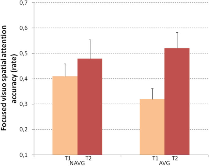 The time X group interaction was significant (F(1,25) = 4.687, p = 0.04 η2 = 0.158; see Fig. 5). Post-hoc comparisons showed a significant improvement in the visuo-spatial attention accuracy of the AVG group (pre-training mean = 0.32; SE = 0.042; post-training mean = 0.52; SE = 0.063, p = 0.001, Cohen’s d = 0.95), whereas the NAVG group did not show any significant improvement (pre-training mean = 0.41; SE = 0.049; post-training mean = 0.48; SE = 0.074). Comparing the mean changes of AVG and NAVG groups, Cohen’s d was = 0.85.