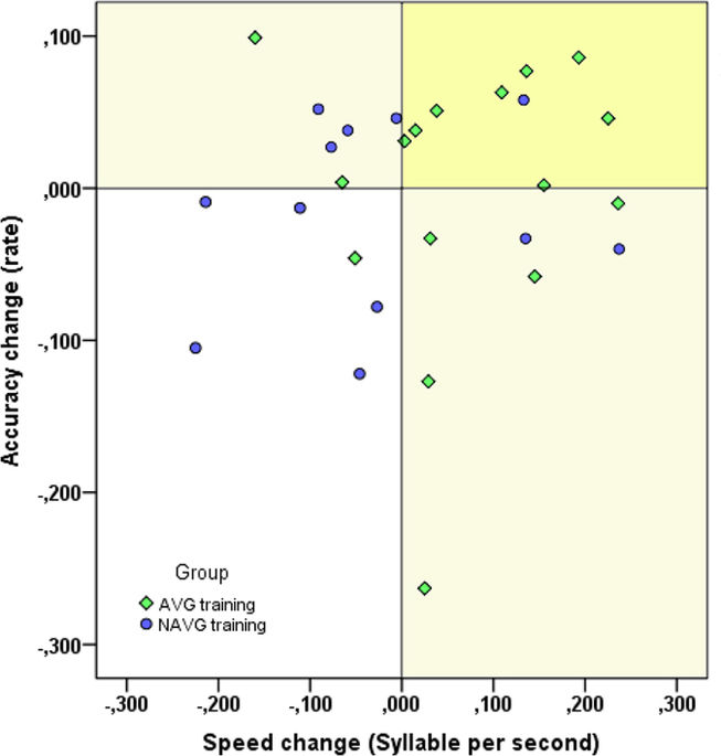 The aim of this analysis is to control the effect of the video game training on reading speed and accuracy for each participant. The mean of word and pseudoword change (in syllable per second) and accuracy (rate) between reading in T2 and T1 are reported in Fig. 3. Eighty-one percent of the AVG participants had an improvement in reading speed (Binomial test, p = 0.021) and 63% of them had an improvement in reading accuracy (Binomial test, p = 0.454) after training. Fifty percent of the AVG participants improved both in speed and in accuracy. Only one of the AVG participants had a worse performance in reading speed and accuracy. In contrast, only 25% of the NAVG participants had an improvement in speed (Binomial test, p = 0.146) and 42% of them had an improvement in accuracy (Binomial test, p = 0.774). Only 8% of the NAVG participants showed an improvement both in speed and accuracy. Forty-two percent of the NAVG participants showed a negative change of reading speed and accuracy.
