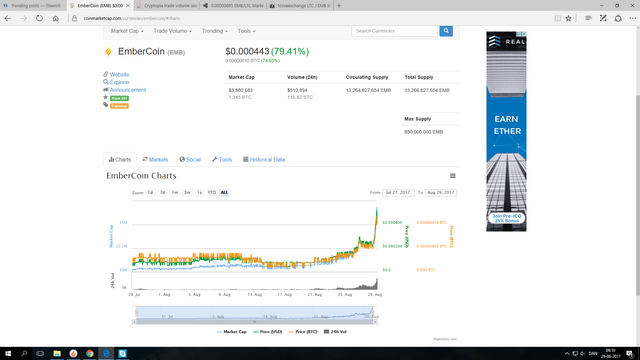 Actually this info on Coinmarketcap.com is a little off the real market, the real market is up more then 100% since I first posted about Embercoin last night (10 hours ago). Before that Ember coin was trading sideways. Remember that even when Embercoin is trading sideways you make 60% pr month in interests from holding the coin in the wallet.