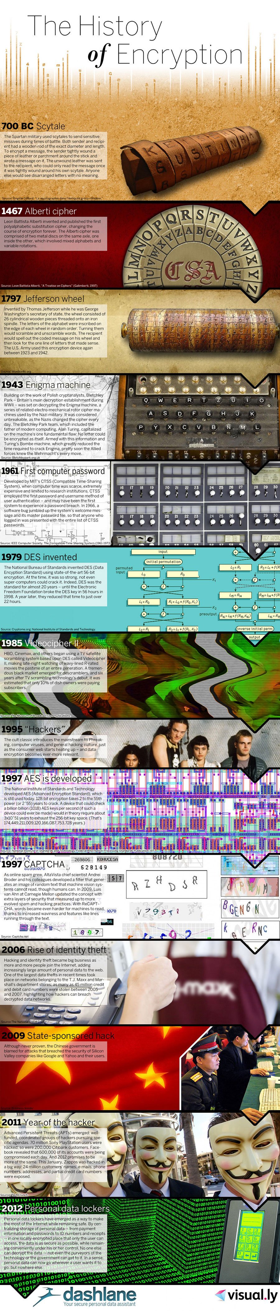 Take a view through the history of encryption, in infographic, from scytales, passwords and captchas up to the almost unbreakable 256-bit encryption.