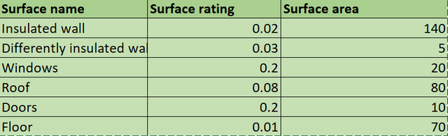 Using the surfaces areas and the coefficients we can quickly calculate the U-value or R-value, depending on what unit you want the result in, for the whole house. In the end just add together the results of all the different surfaces' heat loss. For my loose example based on my house, let's say that it's close to 8kW, for a temperature difference of 21 degrees Celsius. That is calculated by using the above formula, which was explained in depth in the last article: