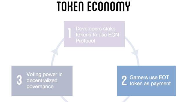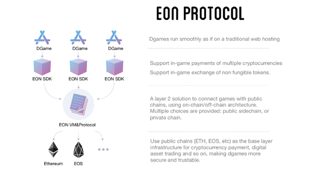 EON Protocol is designed to aid game developers Support in-game exchange of non fungible tokens (digital assets in the game); Provide a layer 2 solution to connect games with public chains (ETH, EOS, etc), using on-chain/off-chain architecture; and Support in-game payments of multiple cryptocurrencies;