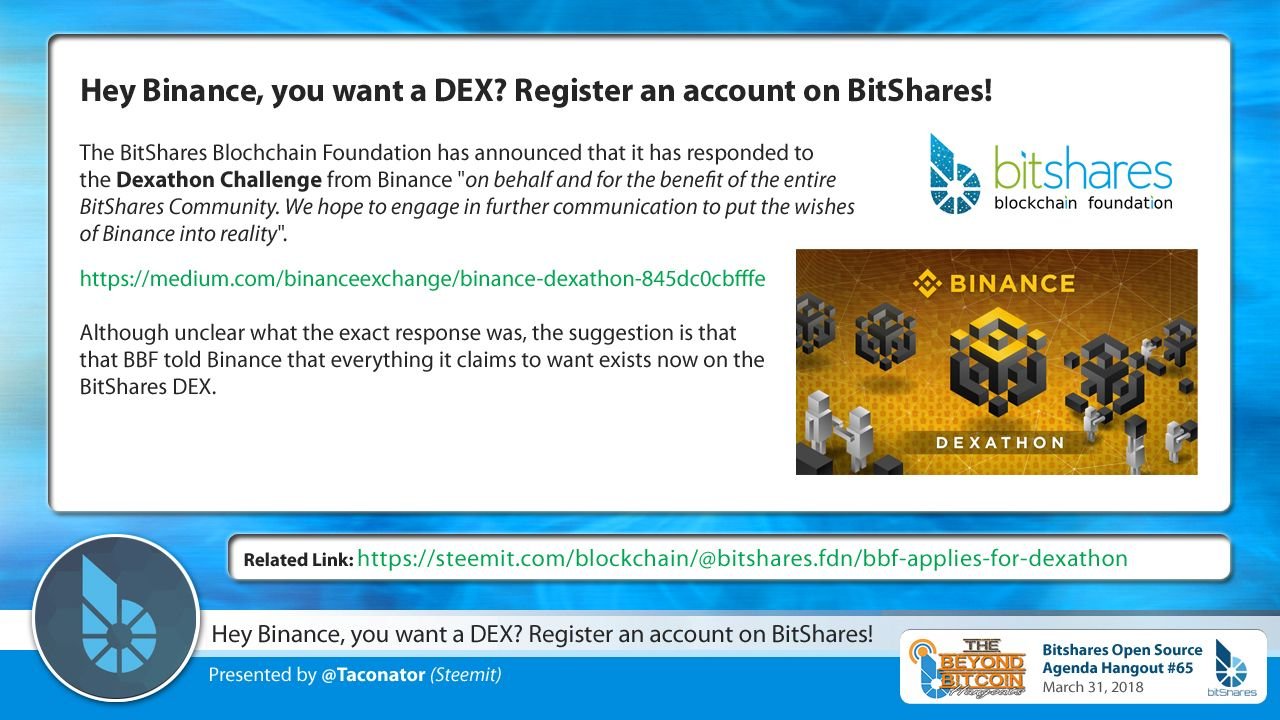 The BitShares Blochchain Foundation has announced that it has responded to the Dexathon challenge from Binance "on behalf and for the benefit of the entire BitShares Community".