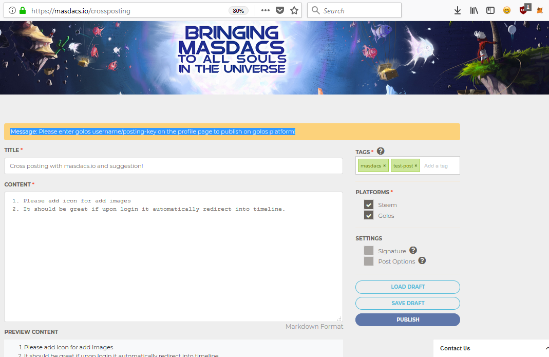 When I try to post my first article with https://masdacs.io/crossposting and try to publish it, error occur. Please see image below;