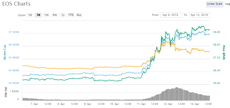 In the past week, we have seen most cryptocurrencies rally in a positive direction signaling a reverse from a challenged Q1 performance. EOS by far outpaced most currencies by jumping more than 30 percent and at one point in time even replaced Litecoin as the 5th largest ranking currency on coinmarketcap.com. EOS continues to gain traction as the airdrop of eosDAC tokens on April 15 draws closer.