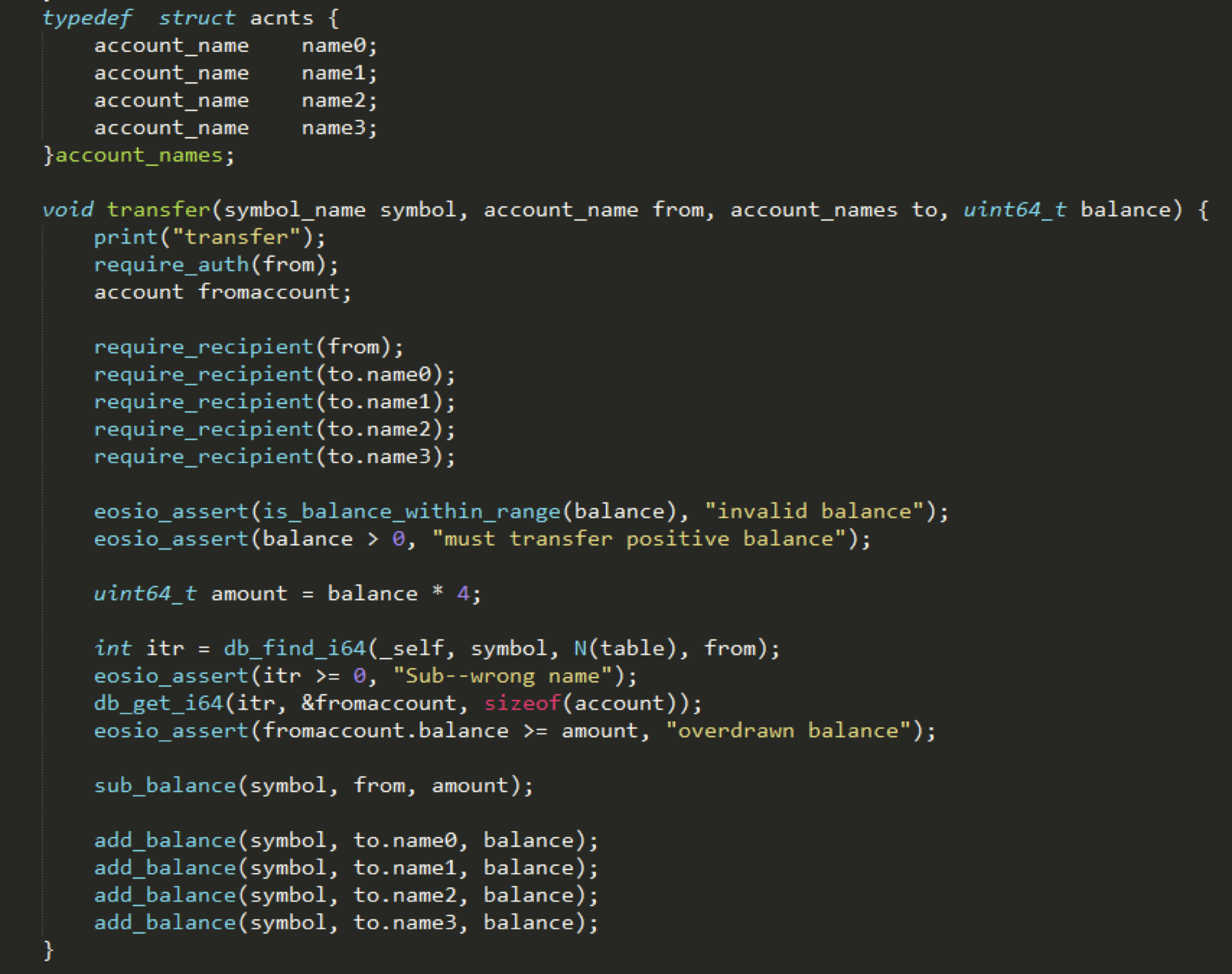 Figure 1 transfer source code, transfer from one account to four persons at the same time
