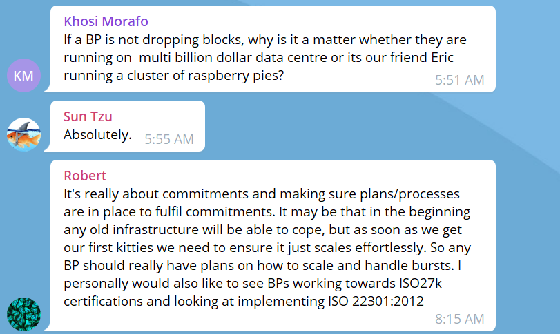 Finally, EOS BlockPros had a wide discussion ranging from BPs honestly reporting their hardware capacity to voters only focusing on 100% uptime: