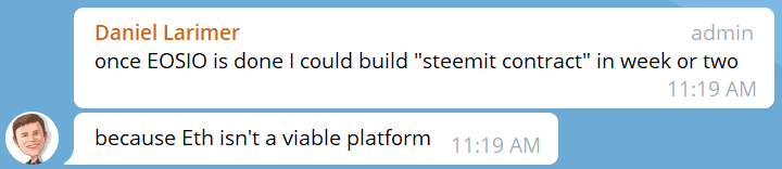 There is so much going on in EOS I just wanted find a place to get a quick news stream. Thank's a bunch. While I am not up to speed and still quite busy with work, your post did help me move forward in understanding where EOS is in its development. You also confirmed for me that Daniel Larimer is solid at every turn. Stan is impressive, but his son's knowledge discourse is leaps ahead of the industry. Often times it is OK to let half answers slide by from developers who know more than they explain. Daniel makes us rethink the idea that only one with true mastery can deliver suitable explanations for the common person.