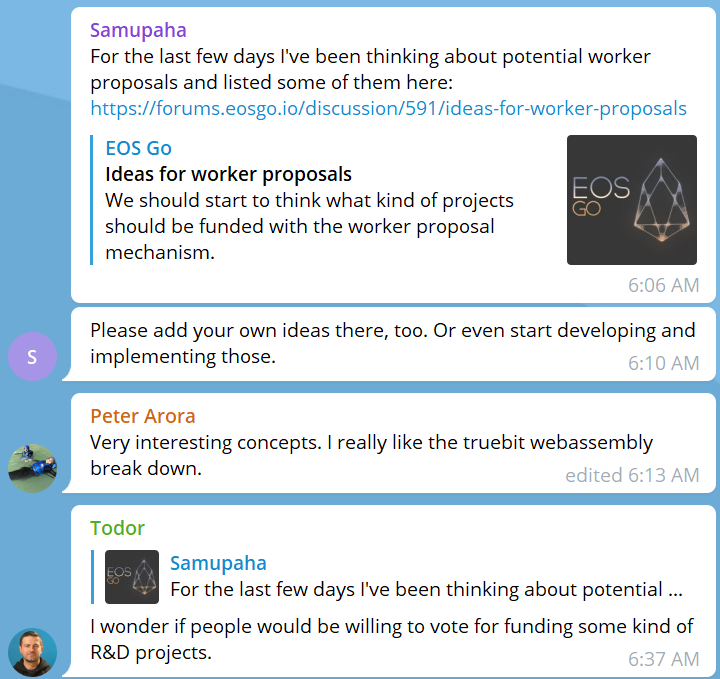 In EOSIO Gov chat, a discussion about early Worker Proposals: