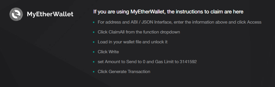 myetherwallet 으로 EOS ICO 참가하신분들은 꼭 읽으세요!won1541 (48)in #eos • 8 years ago (edited)myetherwallet 으로 EOS ICO 지갑으로 이더리움을 보냈으면 따로 컨트렉트 처리를 해줘야 됩니다. ★ 이더리움&토큰전송으로 보내는것 아닙니다 !! '컨트렉트' 메뉴 이용해야됩니다. EOS 토큰은 5일 기간 끝나고 배분됩니다. 1.마이이더월렛 접속 2.컨트랙트 메뉴 클릭 3.EOS 컨트랙트 설정 - 액세스 4.ClaimAll 설정 - 쓰기 5.가스한도 90000 입력 6.트랜잭셩 생성 #kr #kr-ico #coinkorea #ethereum