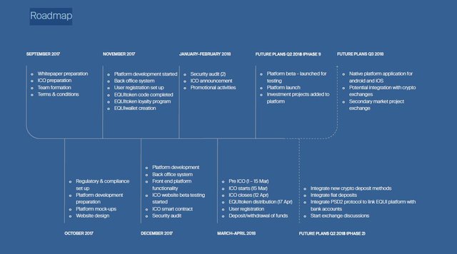 EQUI's road map is available on both the website https://www.equi.capital/ whitepaper ....... and ANN thread https://bitcointalk.org/index.php?topic=2888110.new#new