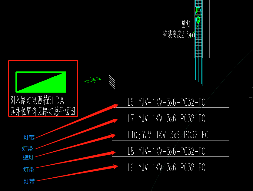 在墙面上。这5给回路中。6号回路是最高处的灯带。7号回路是二楼的灯带。8号和9号回路是广告牌的灯带。只有10号回路是壁灯。在详细图纸中能看到它的线路走向。这些灯带都是LED灯带。每个等带1米。每一米是12瓦。中样我们就能快速的冲图纸中找到回路的耗电量和如何布线。