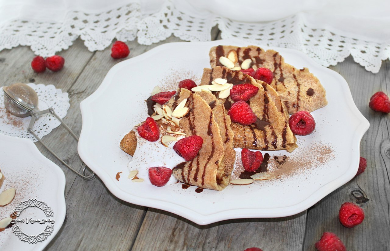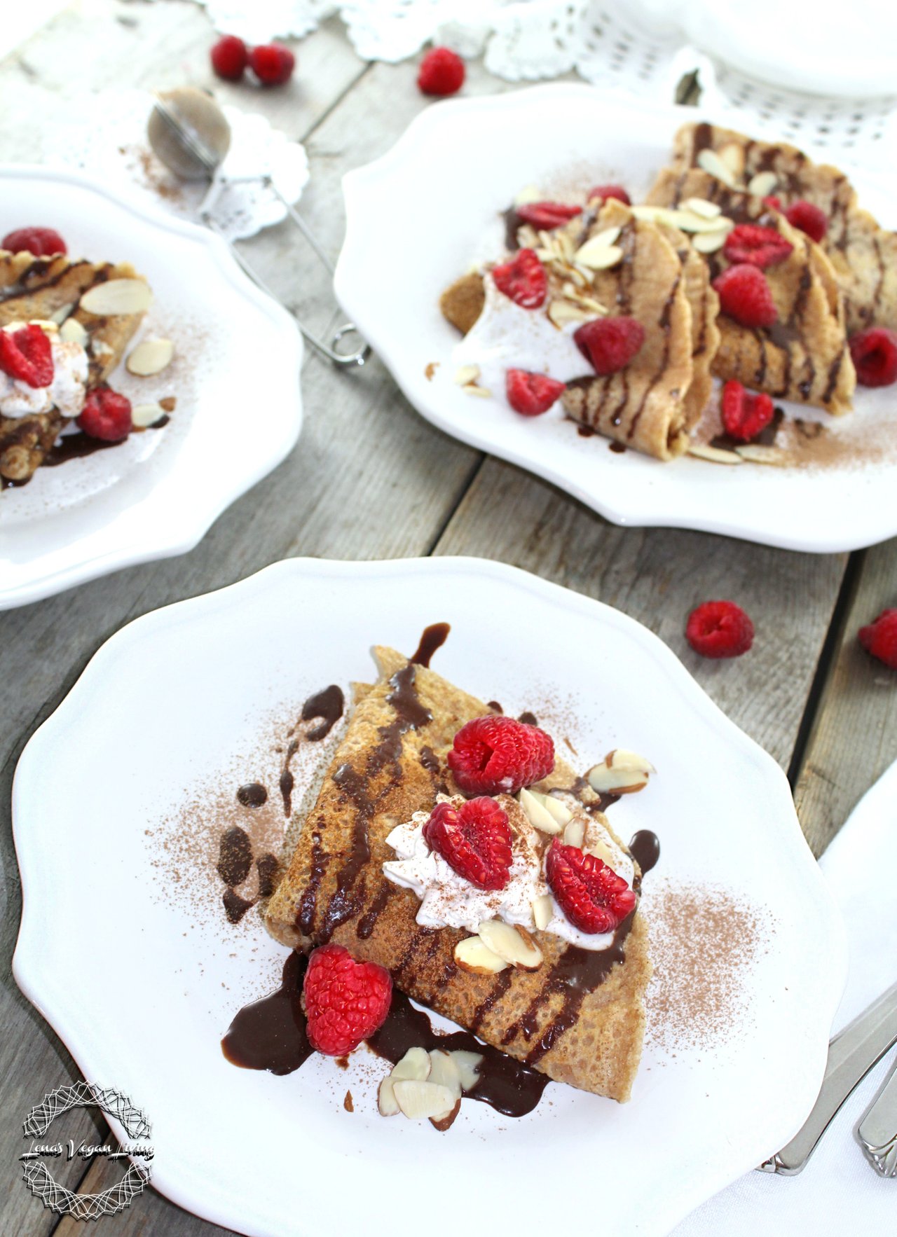 Spelt Crepes with Chocolate Syrup and Raspberries