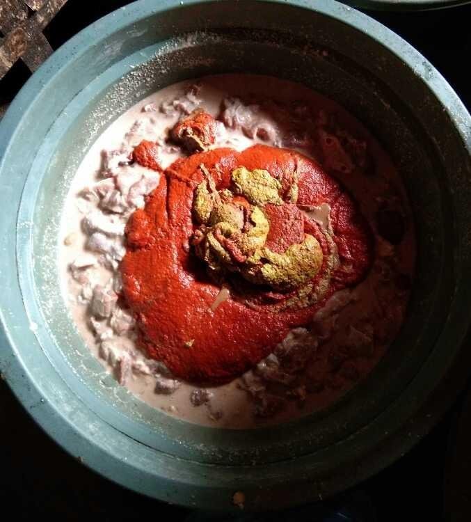 Next enter the goat meat that has been stirred with spices that have been milled then add a little thick coconut milk. After that wait until boiling and the meat a little bit and then added coconut milk and pumpkin in accordance with its own dosage for more delicious results again recommended to be cooked by using firewood.