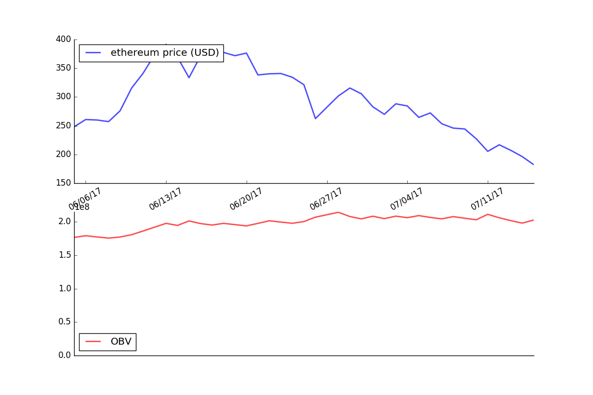 The graph below shows the OBV applied to the price of Ethereum using daily price data for the last 40 days.