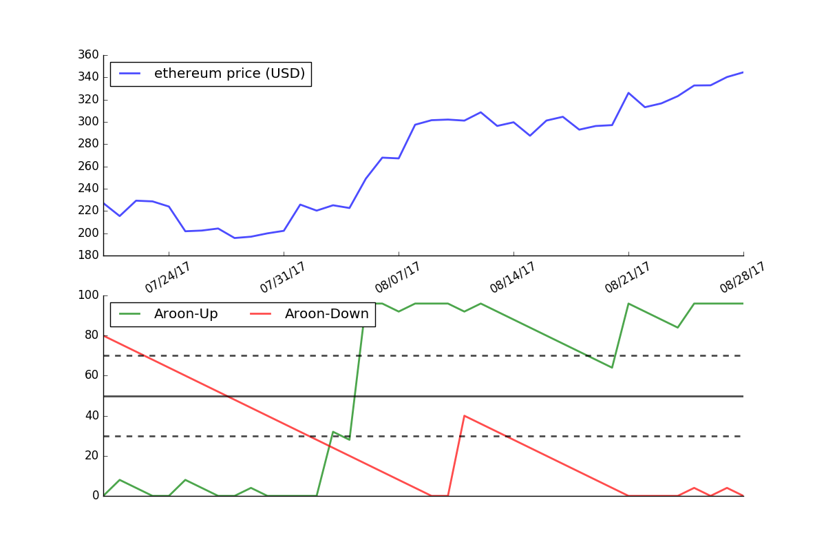 The graph below shows the Aroon Indicator using the price of Ethereum over the last 40 days.