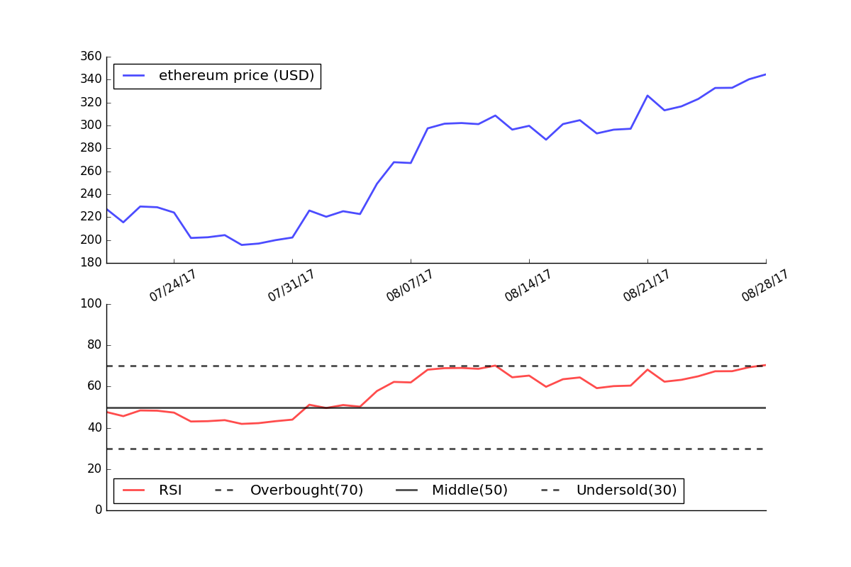 The graph below shows the RSI applied to the price of Steem based on daily price data for the last 40 days.