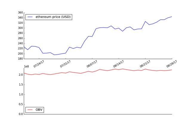 The graph below shows the OBV applied to the price of Ethereum using daily price data for the last 40 days.