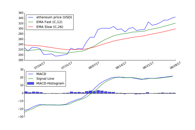 The graph below shows the MACD applied to the price of Ethereum using daily price data for the last 40 days.