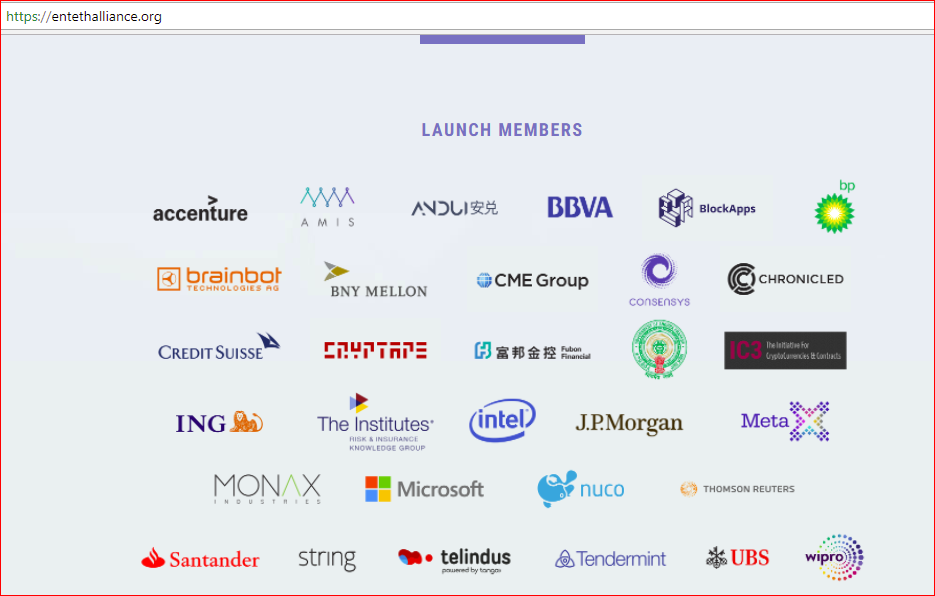 • By May, the nonprofit organization had 116 enterprise members—including ConsenSys, CME Group, Cornell University's research group, Toyota Research Institute, Samsung SDS, Microsoft, Intel, J.P. Morgan, Cooley LLP, Merck KGaA, DTCC, Deloitte, Accenture, Banco Santander, BNY Mellon, ING, and National Bank of Canada.