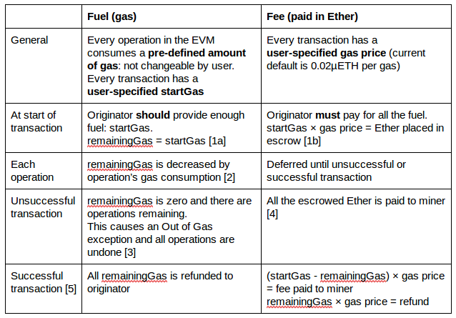 Metering is different from fee and gas is different from ether. To help clarify this, consider the term “gas” synonymous with fuel. A transaction must provide enough fuel (startGas) to cover its entire use of the EVM’s computation and storage facilities. All remaining gas is refunded to the transaction’s originator: the user who initiated the transaction. A transaction that runs Out of Gas is reverted, but is still included in a block and the associated fee is paid to the miner.With an overview from the perspective of fuel, let’s turn to an overview of fees. While every operation in the EVM consumes a predefined amount of gas that is fixed (for example, a MUL operation always consumes 5 gas), a user can specify a gas price in every transaction. The current gas price is 0.02µ Ethers, or 0.00000002 ETH. The fee an originator pays a miner is the transaction’s (startGas - remainingGas) × gas price.Here is a summary of the influences of transaction fuel and transaction fee: