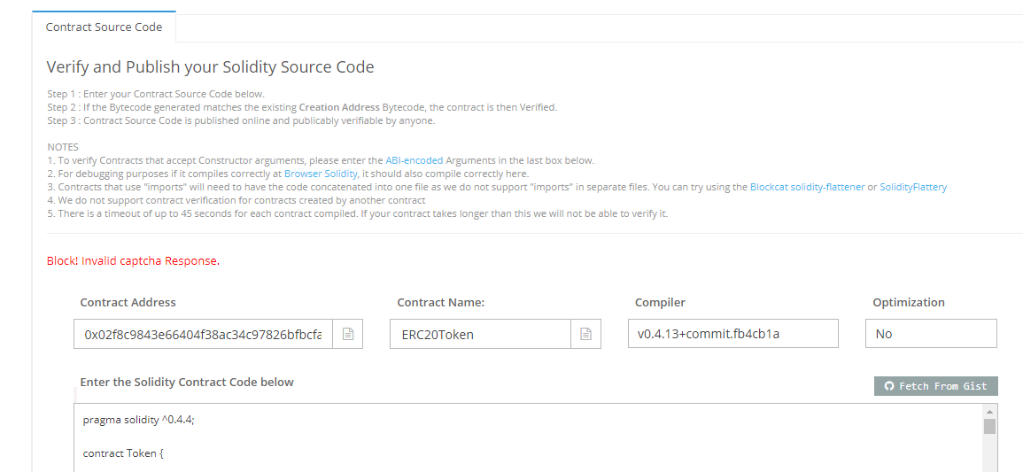 You are viewing a single comment's thread from:RE: How To Create Your Own Ethereum Token In An Hour (ERC20 + Verified)View the full contextjoshuapark66 (25)in #ethereum • 7 years ago Thank you for your posting. I was followed you, but I have an error msg on verify step. "Block! Invalid captcha Response." Please check the below and help me.
