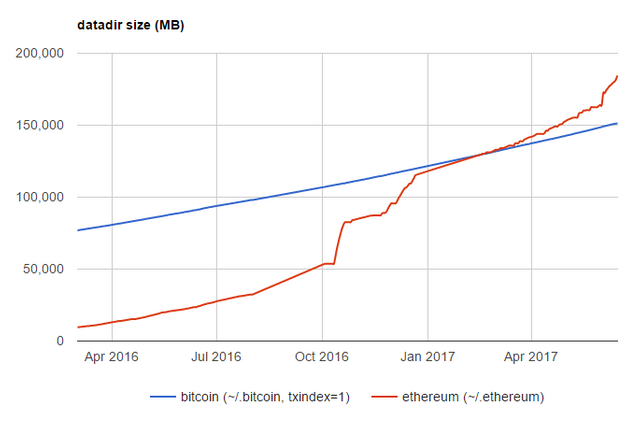 "Ethereum’s (ETH) blockchain is now larger than Bitcoin’s at around 180 gigabytes, with experts warning further increases may spell disaster.