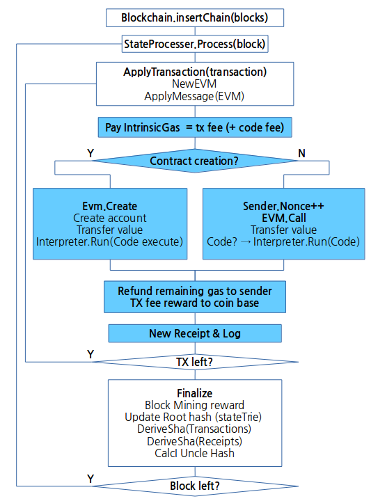 예전 몇몇 글을 통해 블록을 체인에 넣을때 트렌젝션 처리와 상태의 변화가 일어나는것을 알아보았었고, 담당하는 함수가 insertChain이라는것도 이미 알고 있었죠.