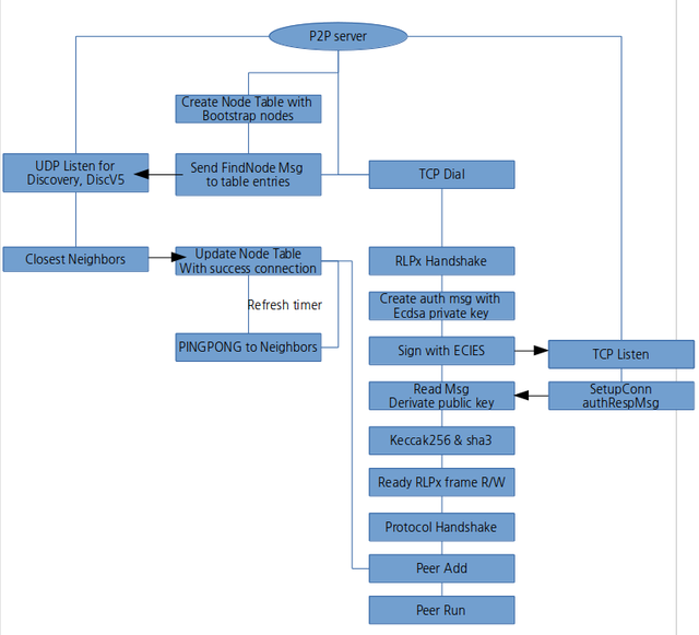 - 이제 테이블이 완성되었으니 TCP 다이얼러를 생성하여 테이블 상의 피어들에게 연결요청을 합니다. 요청이 수락되면 피어와 2번의 핸드쉐이크를 하게 됩니다. 첫번째는 RLPx 핸드쉐이크이고 두번째는 프로토콜 핸드쉐이크 입니다. 과정이 복잡해서 단순히 나열만 해보고자 합니다.