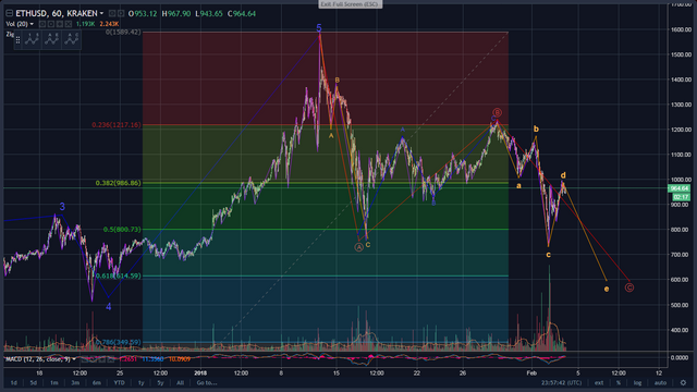Here is ETH/USD at Kraken! After a fulfilled Elliot Wave cycle the usual correction is an ABC wave, and it can be pretty deep. 0.618 fibonacci is just around $600, and price might just pierce it to finish this correction.