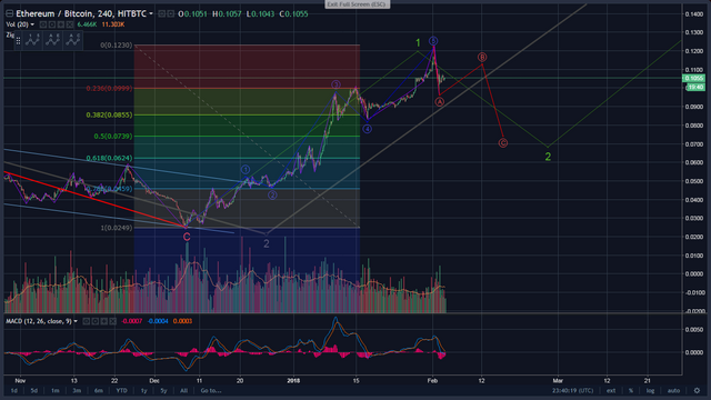 When ETH is done correcting (around early March) it'll shoot back up, just like how BTC does when BTC finishes correcting. (which will then fulfill the ETH/BTC rising ratio; your wave 2 to wave 3).