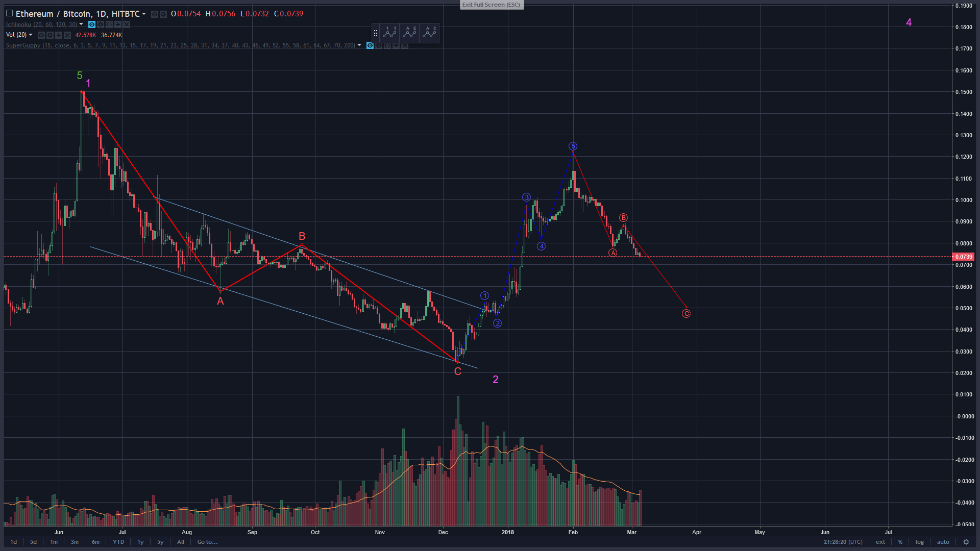 The ETH/BTC pair went on correcting down, but it did not quite follow the path as I charted.