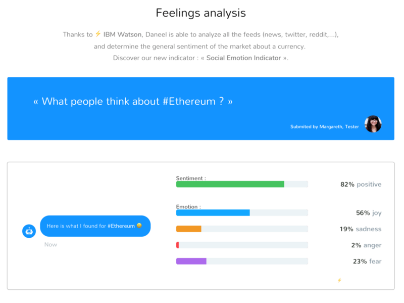 Not withstanding examining and outlining data, we wish to enable Daneel to break down the emotions of the market utilizing a « Social Emotion Indicator » work. Daneel AI will gathers messages posted on social systems, at that point investigations them and passes on to the client the dominating on their preferred web opinions encompassing the cryptocurrency.