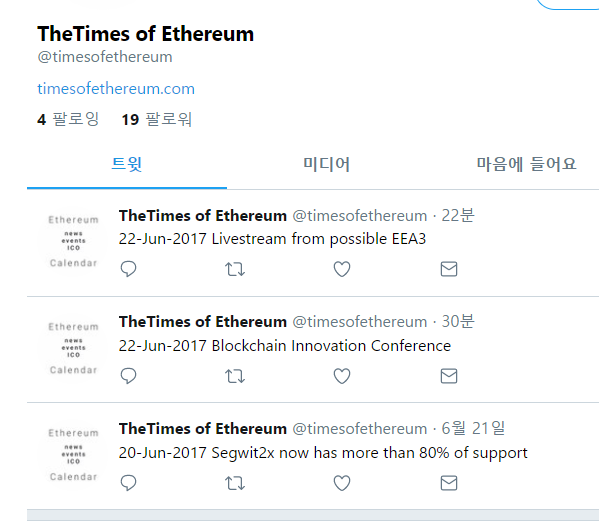 이더리움 공식트위터는 아니지만 이더리움 일정 정리 사이트인 https://timesofethereum.com/ 에서 트위터에 22일 현재 생방송 진행중인 Blockchain Innovation Conference 2017 와 EEA3 언급을 했습니다.