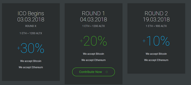 The pre-sale took place in two stages with the price of 1500 AltX/ ETH and bonus up to 50%. Similarly, ICO sale will also take place in two stages. The first stage of ICO started on 3rd March 2018. The price will be 1200 AltX per 1 ETH. The total tokens allocated for this stage is 9,250,000 but makes up to 10,800,000 with 20% bonus.