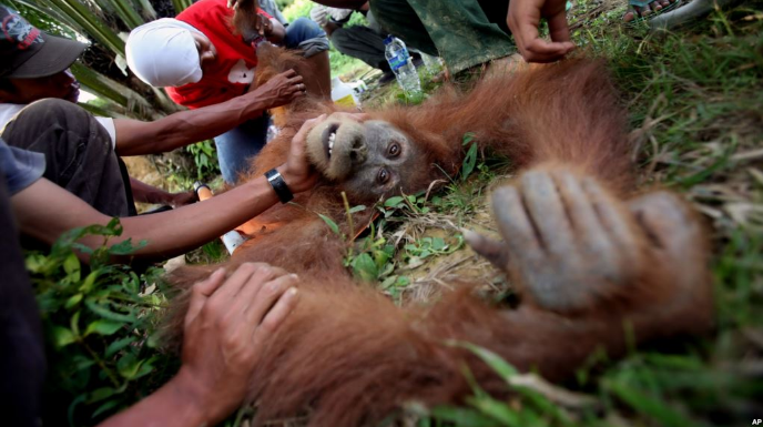Many orangutans are hunted by humans, because it enters the territory of the plantation of a citizen or company and steals its food so that it is considered a pest by humans. In addition, orangutans are hunted for their skulls for sale at a high price.