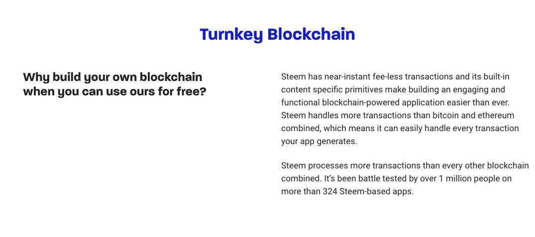 Steem allows you to integrate a blockchain with ease (and almost free) so you can focus on your app and community instead of wasting resources trying to build your own blockchain.