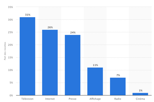 Répartition des recettes publicitaires nettes des médias en France en 2015, par média