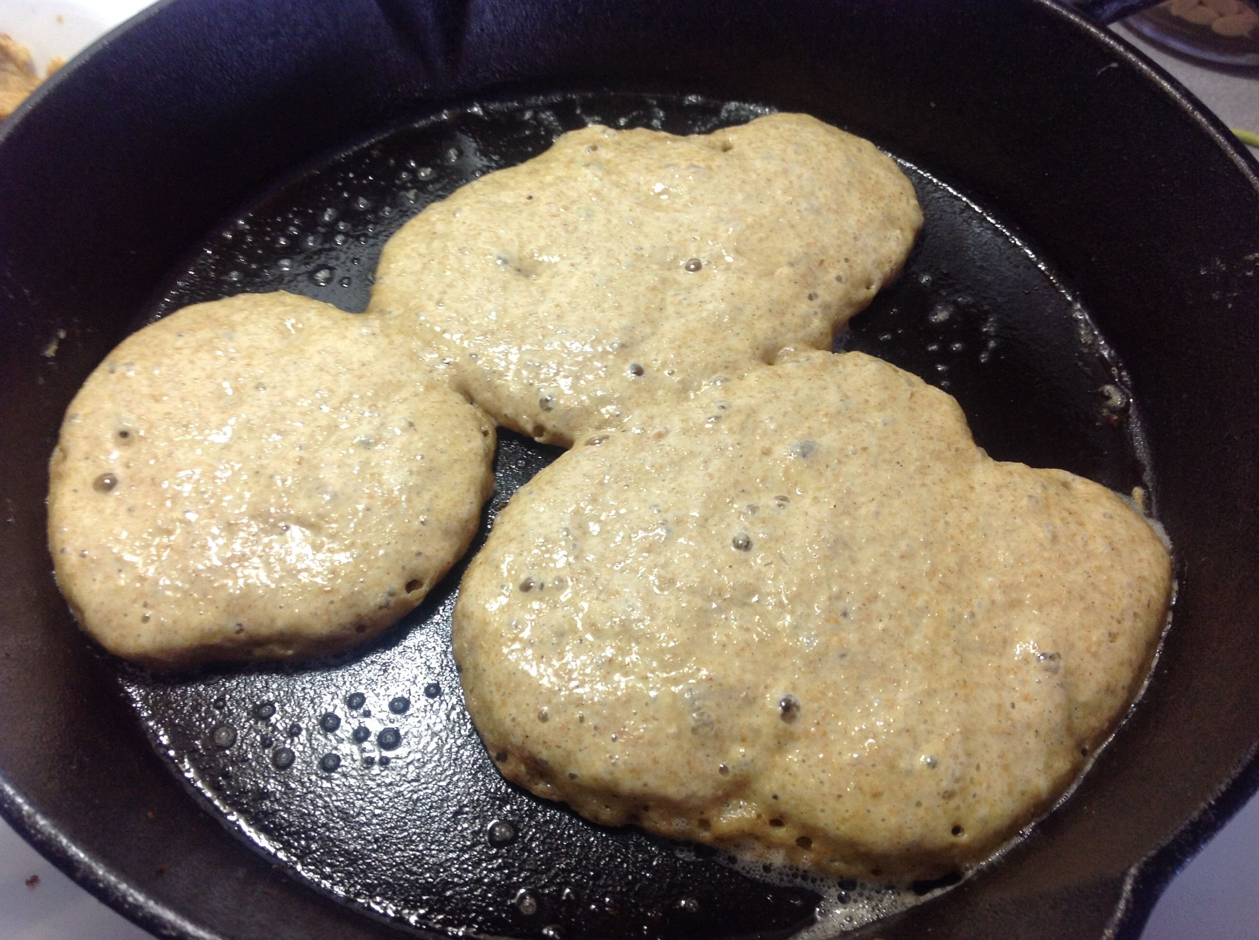 Mix flour and kefir before bed if you intend to have pancakes for b-fast. In the morning mix all other ingredients. You can add spices, fruit, anything you want according to your own tastes! Make sure your skillet is hot, these pancakes take longer to cook and will stick if your pan isn't hot enough. My cast iron skillet works awesomely!