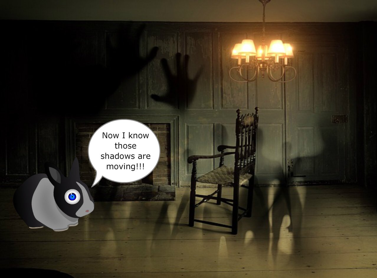 As it got late, Marx the rabbit decided it was time to go home. Jeezzle left her in the entryway to get her some food to take home. Standing there by herself the rabbit realized the room was growing colder and colder. The shadows dancing as the candles on the candelabra seemed to be moving and forming shapes. Looking around Marxrab realized that the shadows had taken the shape of people and they were surrounding her!