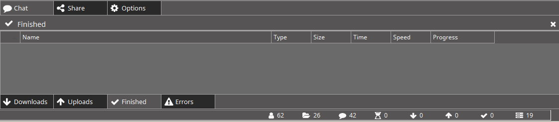 Las pestañas se dividen en función de la clase de información que pueden ofrecer. Normalmente, las que tienen relación con la contabilización inmediata de datos como la descarga / subida de datos, errores de red y descargas finalizadas se encuentran abajo. Las pestañas que se encuentran arriba están relacionadas con las opciones del programa y el acceso al chat.