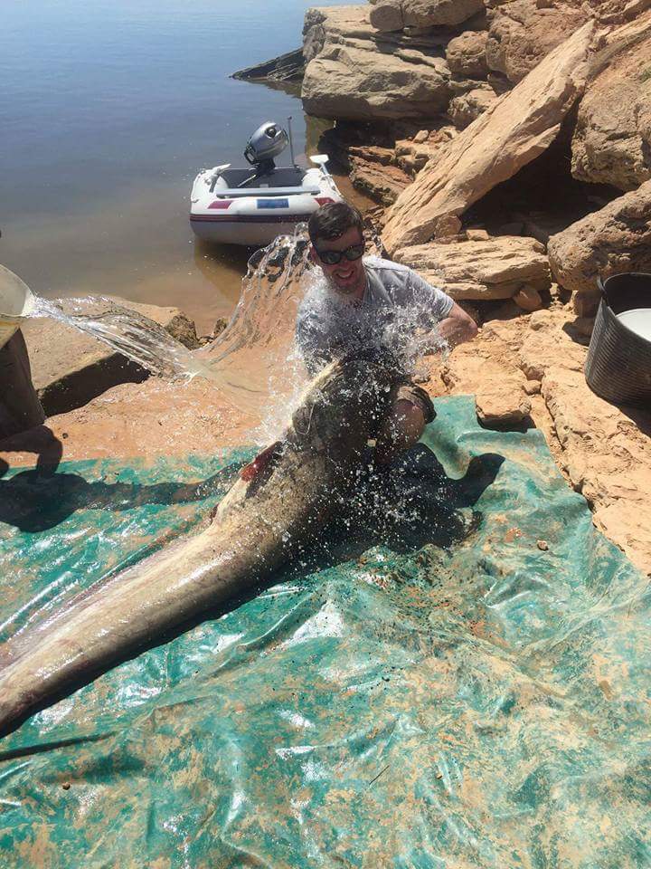And ghe guide waded in and grabbed the leader and guided the catfish to the bank while Grayham grabbed tge rod so i could jump in and land the fish with Andy. . My heart was pounding when its head came above the waters surface.