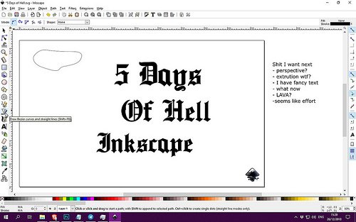 I ended up deciding and starting to make a cover for my 5 Days of hell Inkscape version instead. Sticking to generic shape creation via the bezier tool.